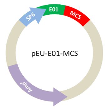 With the pEU Vector Set, we are providing dedicated expression vectors for use in the wheat germ cellfree protein expression system. This includes vectors for working with the GST-, His, or DYKDDDDK-affinity tag as well as the positive control vector pEU-E01-DHFR for testing your reaction conditions. Each vector has an SP6 RNA polymerase promoter to drive RNA expression followed by the E01 enhancer. The E01 enhancer is required to initiate the translation reaction. The coding region for the protein of interest can be cloned into any of the restriction sites within the multi cloning site of the vectors. However, we advise to use the closest possible restriction site near the E01 enhancer to assure effective initiation of translation. The SP6 RNA polymerase does not require any terminator sequence to stop transcription.