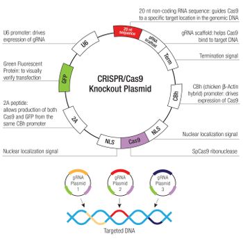 CRISPR/Cas9 Knockout (KO) Plasmids consist of a pool of three plasmids each encoding the Cas9 nuclease and a target-specific 20 nt guide RNA (gRNA) designed for maximum knockout efficiency